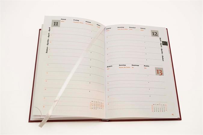 Denný diár, ročný, A5, ktorý pomáha s plánovaním denných úloh na elegantnom bielom papieri s dvojfarebnou potlačou.