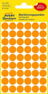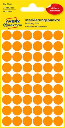 Etikety, okrúhle, priemer: 12 mm, AVERY ZWECKFORM, neónovo oranžové, 270 etikiet/bal
