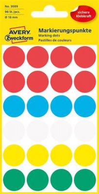 Etikety, okrúhle, priemer: 18 mm, AVERY ZWECKFORM, 5 rôznych farieb, 96 etikiet/bal