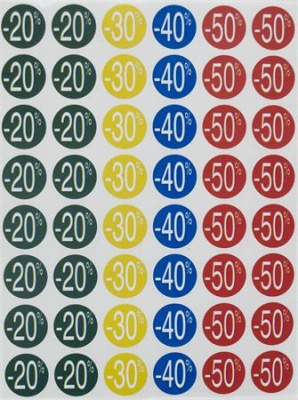 Farebné predtlačené kruhové etikety na označovanie rôznych zliav. Prehľadné a výrazné riešenie pre akciové ponuky!