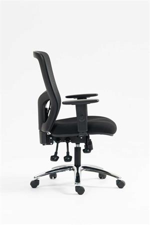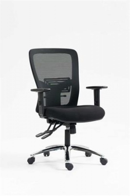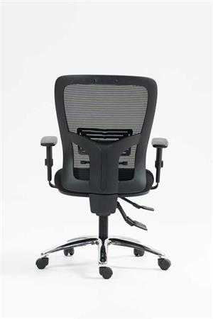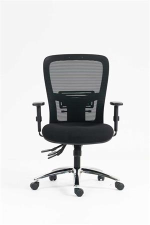 Kancelárska stolička s pohodlným sedadlom dizajnové prevedenie s hrubým, tvarovaným polstrovaním sedadla pre vyšší komfort pri sedení výškové nastavenie pomocou plynového piestu vyvýšené, priedušné sieťované operadlo s nastaviteľnou bedrovou opierkou výšku operadla je možné nastaviť pomocou račňového mechanizmu: jednoducho, jedným pohybom asynchrónna mechanika nastaviteľný uhol operadla nastaviteľný uhol sedadla nastaviteľná hĺbka sedadla nastaviteľná výška opierok nosnosť: 160 kg Poťah: sedadlo: protioderová látka operadlo: napnutá sieťovaná tkanina