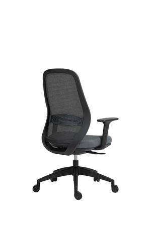 Kancelárska stolička s pohodlným sedadlom dizajnové prevedenie s hrubým, tvarovaným polstrovaním sedadla pre vyšší komfort pri sedení výškové nastavenie pomocou plynového piestu priedušné sieťované operadlo s nastaviteľnou bedrovou opierkou synchrónna mechanika nastaviteľná hĺbka sedadla nastaviteľná výška opierok nosnosť: 130 kg Poťah: sedadlo: protioderová látka operadlo: napnutá sieťovaná tkanina